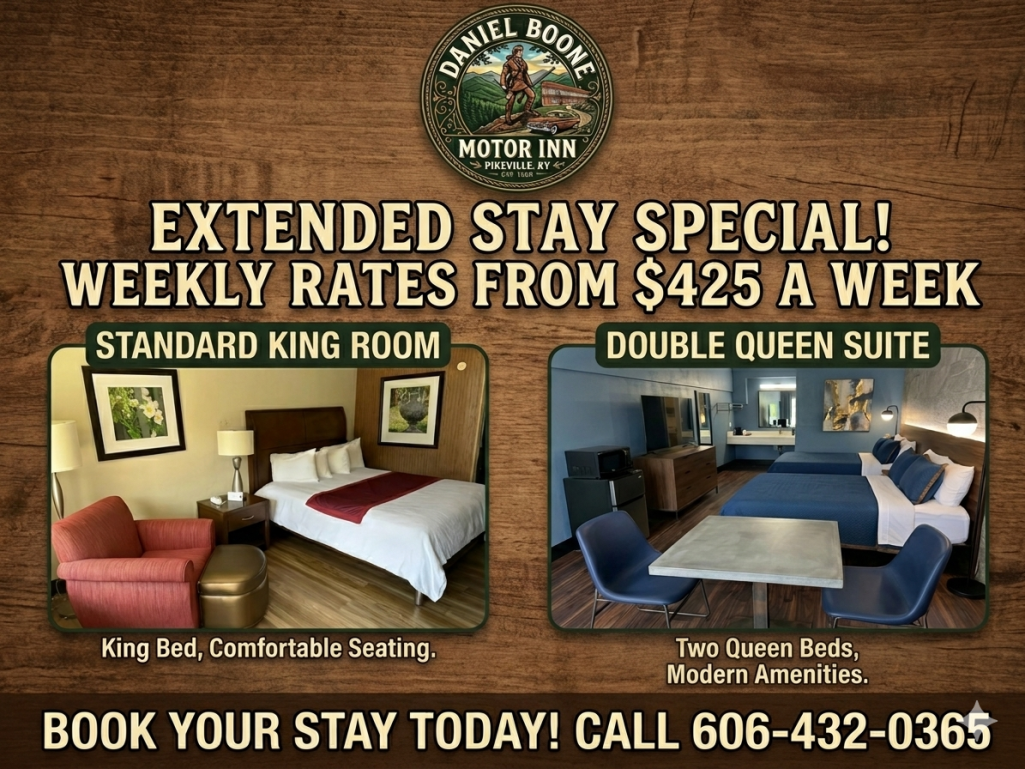 Experience a warm welcome and relaxing stay at Daniel Boone Motor Inn featuring clean rooms, guest laundry, and a convenient lobby open daily until 11pm.
